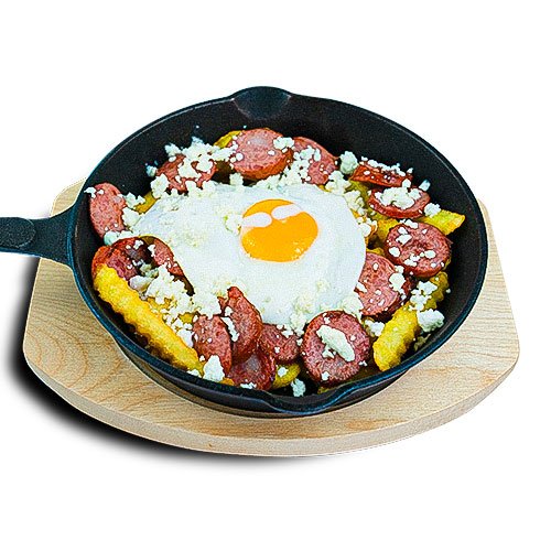 Cartofi Prăjiți cu Telemea, Cîrnați și Ochiuri