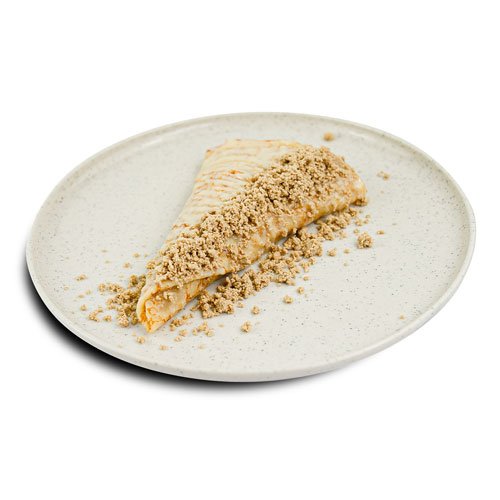 Clătită, pastă de arahide, cremă de fistic, cataif, topping de ciocolată, fulgi de fistic
