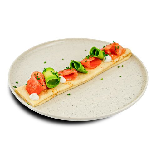 Clătită, Cremă de brânză, Somon, sos de Smântână, ceapă Verde.