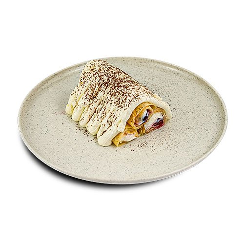 Pancakes, Umplutura de vișine, Cremă dulce. Decor: Zahăr pudră.