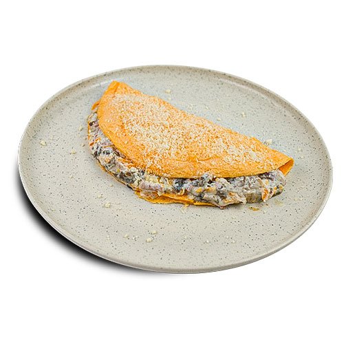 Clătită, sos alb cremos, ciuperci champignon, carne de pui, brânză cheddar, unt.