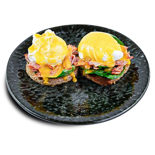 Pâine integrală, Ou poșat, Bacon crispy, Sos Olandez, Spanac.