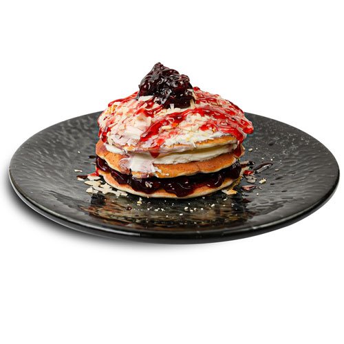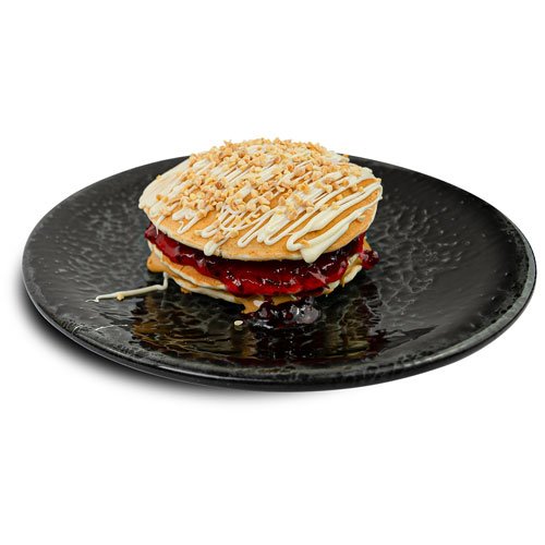 Pancakes, Ciocolată Albă, Pasta de arahide, Gem de Coacăze, Arahide.
