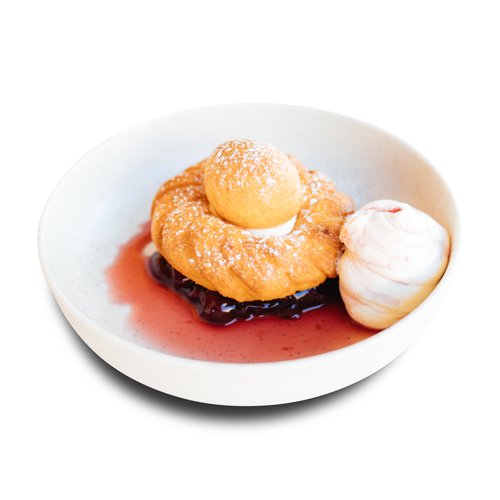 Clătită, cremă dulce, colorant alimentar E120, căpșuni, zmeură, topping fructe de pădure, marshmallow