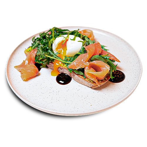 Pâine Integrală, Guacamole, Ouă, Salată mix, Somon Slab Sărat, Ulei de măsline, Cremă balsamică