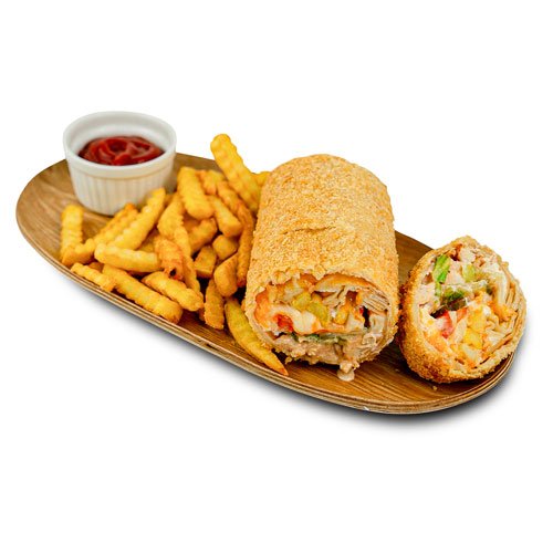 Wrap, Castraveți murați, Sos cocktail, Iceberg, Ceapă marinată, Carne de pui, Cheddar, Mozzarella, Roșii, Cartofi pai, Tempura, Panko.