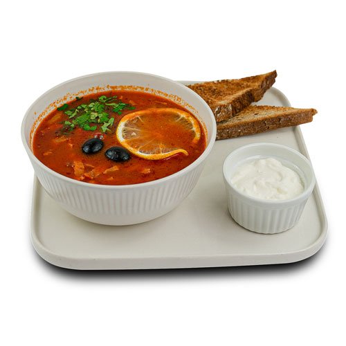 Stock de pui, Mix de cărnuri afumate, Măsline, Castraveți murați, Ceapă Galbenă, Bulion de roșii, Condimente, lamâie, Smântână.