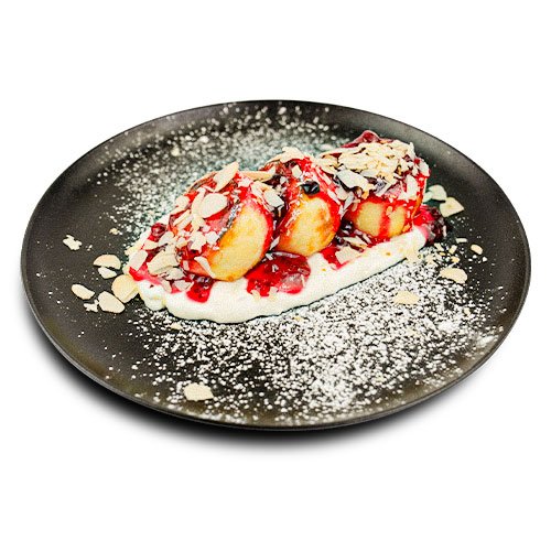 Brânză de vaci, Făină, Ouă, Zahăr, Smântână, Gem de Coacăză, Fulgi de Migdale.
