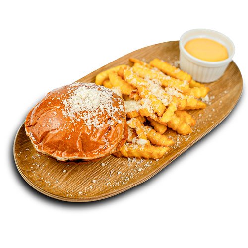 Chiflă Brioche, Carne de Vită Black Angus, Sos BBQ, Iceberg, Bacon, Castraveți Murați, Ceapă Roșie Marinată, Brânză cheddar, Cartofi Pai, Sos Cheddar.